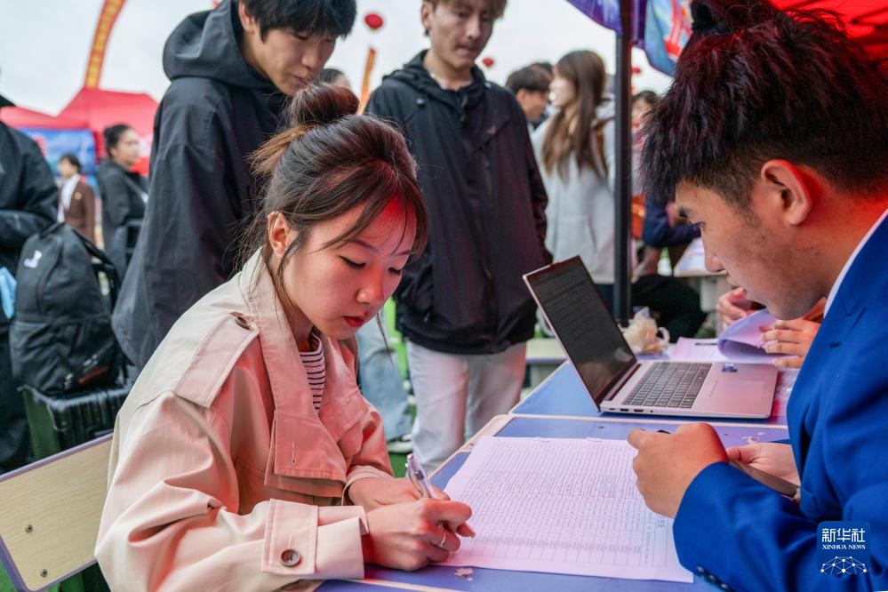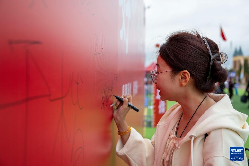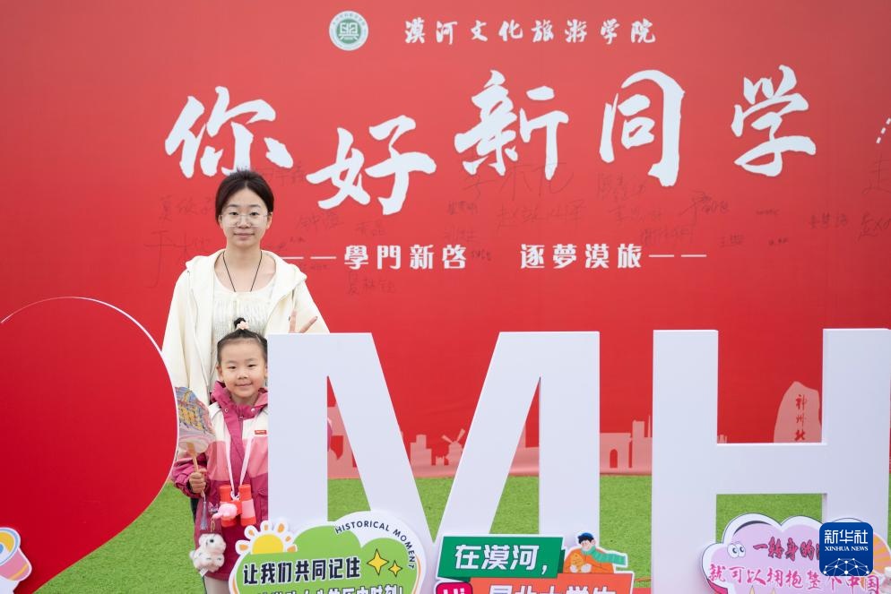 9月13日,一名新生在漠河文化旅游学院内的迎新板上签名留念。