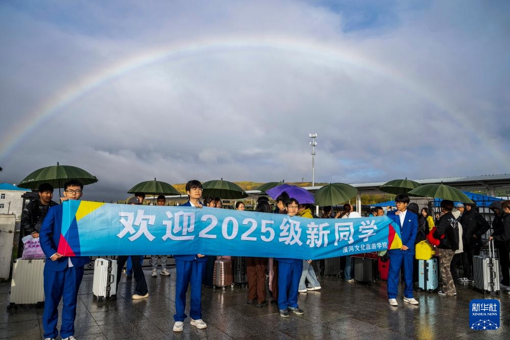 9月13日,漠河文化旅游学院的新生和家长在漠河火车站出站口集合。