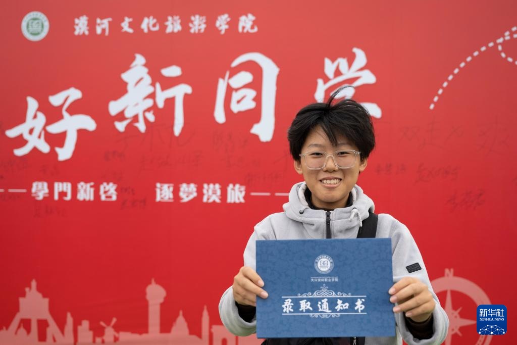 9月13日,在漠河文化旅游学院,一名新生展示录取通知书。