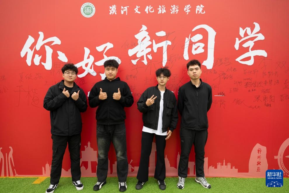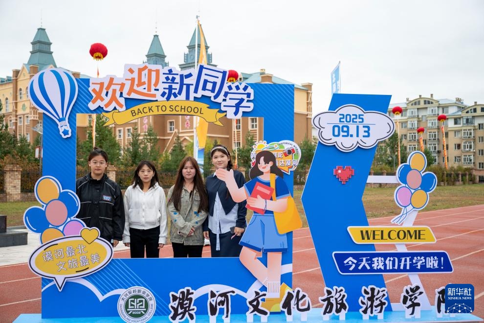 9月13日,在漠河文化旅游学院,新生在展板前合影留念。