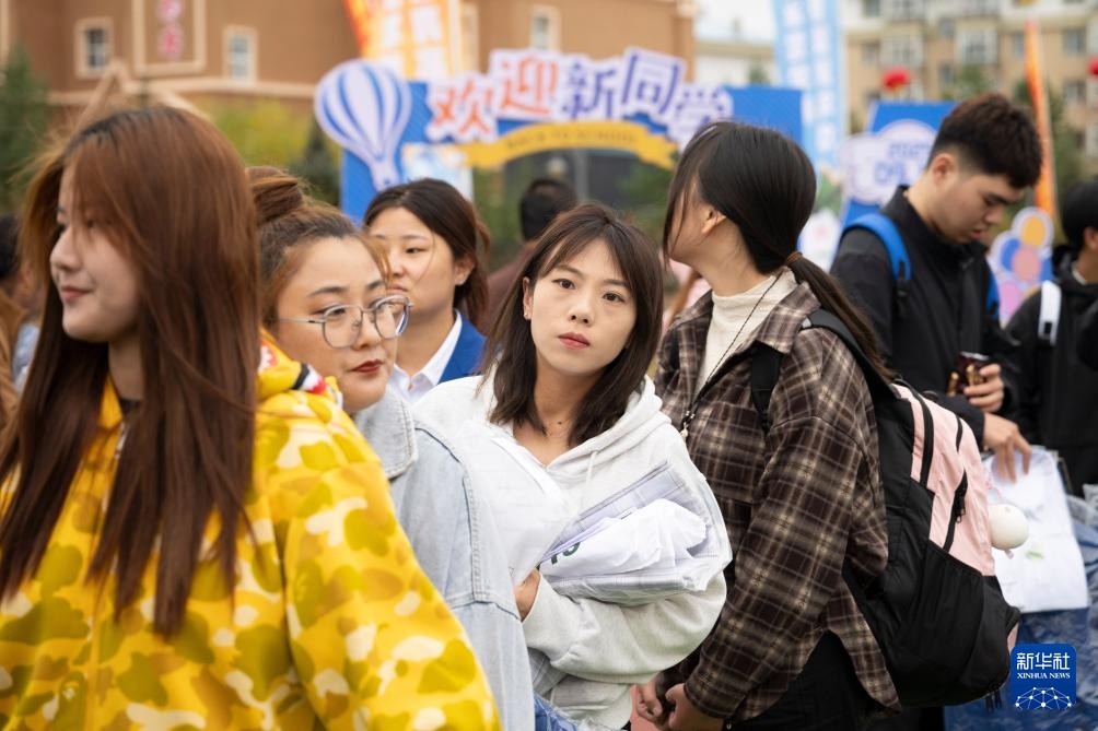 9月13日,在漠河文化旅游学院,新生们排队领取物品。