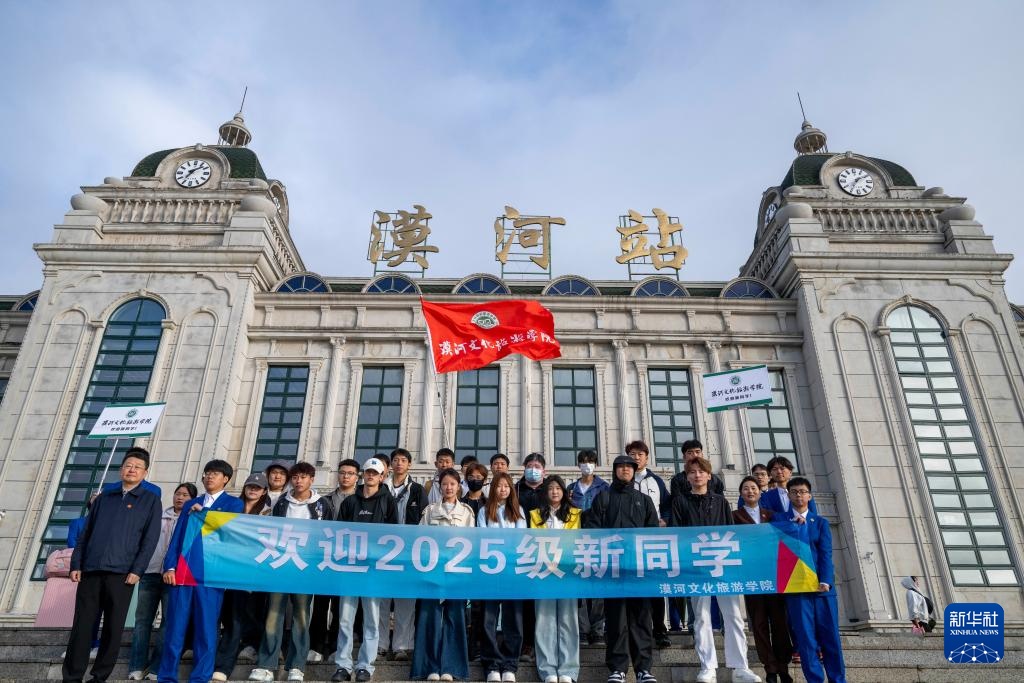 9月13日,漠河文化旅游学院的新生在漠河火车站前拍照。