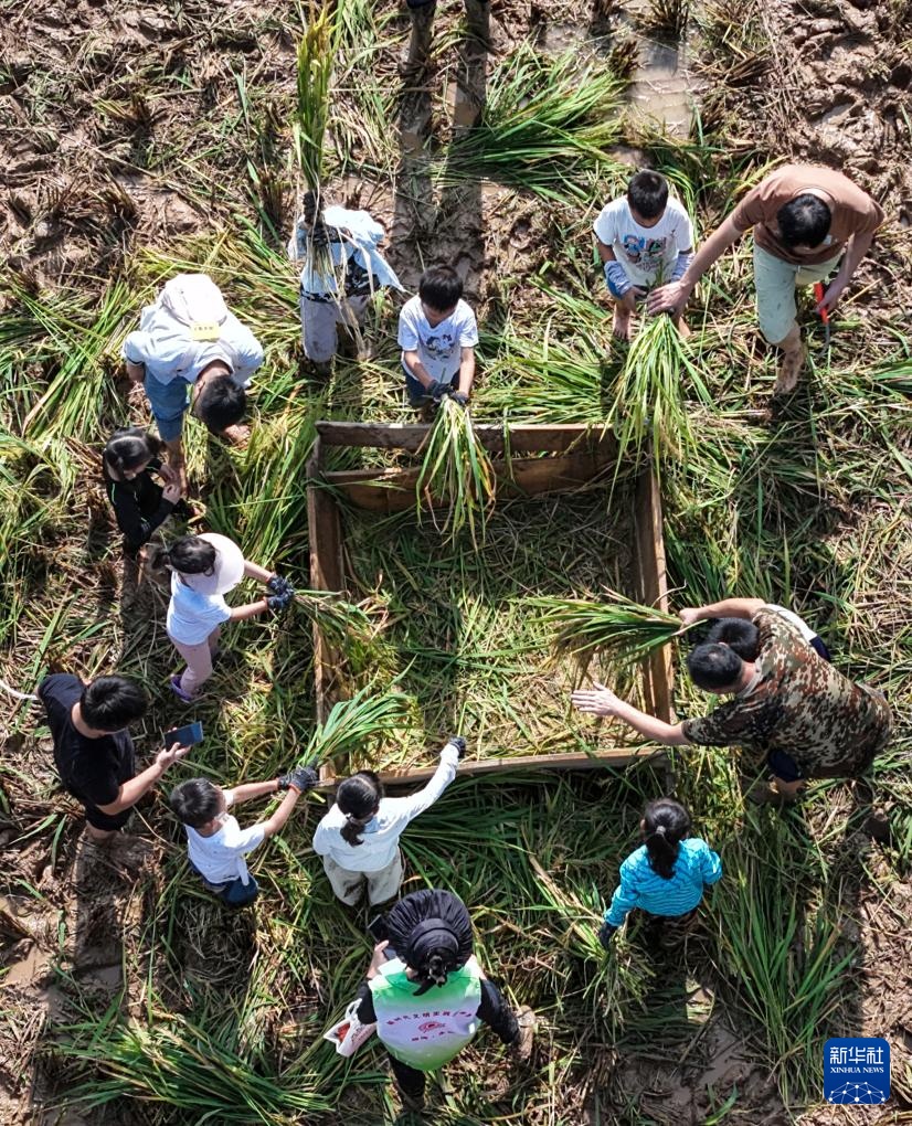 9月13日,在四川省成都市双流区永安镇梨园村,孩子们在家长的带领下体验收获稻谷。