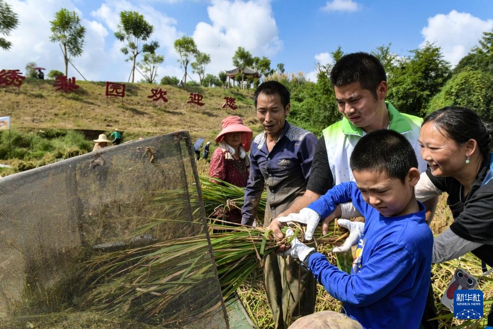 9月13日,在四川省成都市双流区永安镇梨园村,孩子们在家长的带领下体验打稻谷。