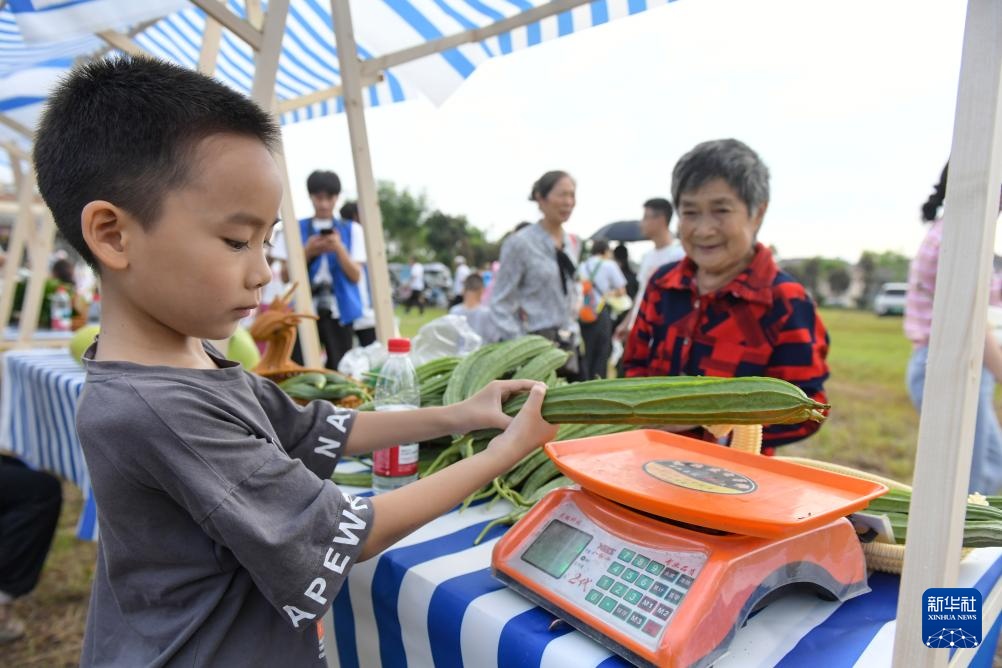 9月13日,在四川省成都市双流区永安镇梨园村,小朋友体验义卖农产品。