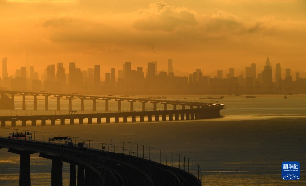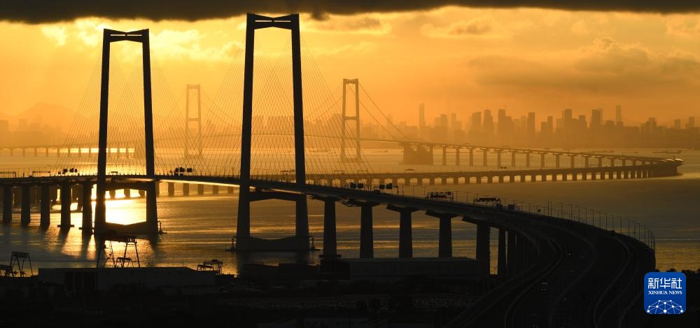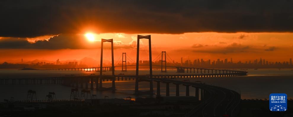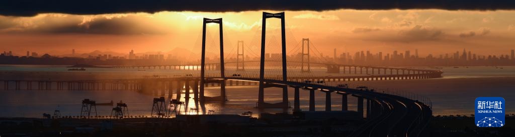 9月14日拍摄的沐浴在晨曦之中的深中通道与远处的深圳市区。