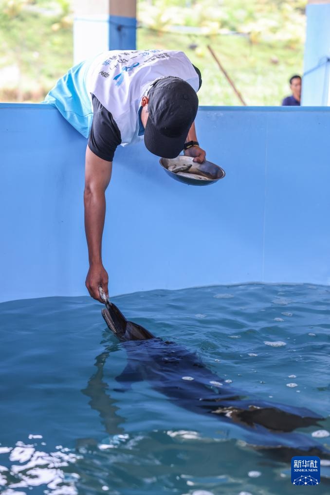 9月14日,在位于海南陵水的救助中心,救助人员给海豚“万万”喂食。