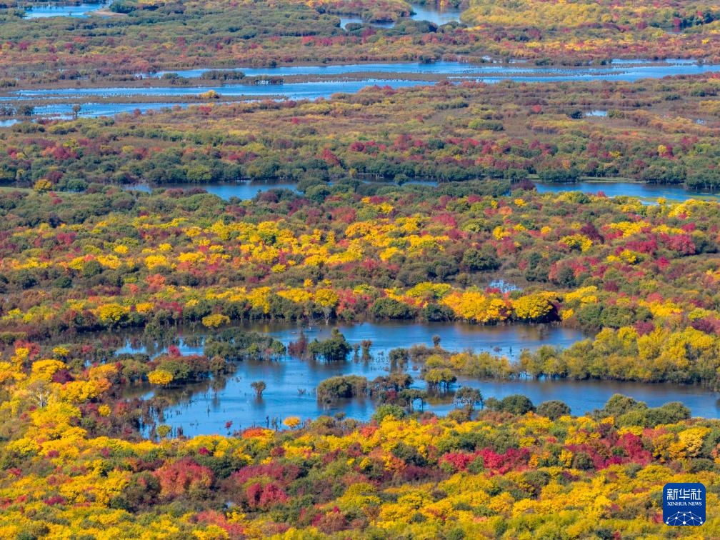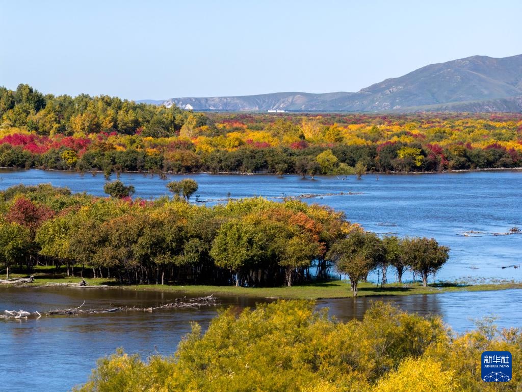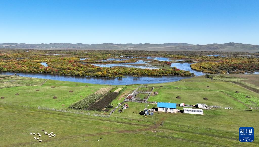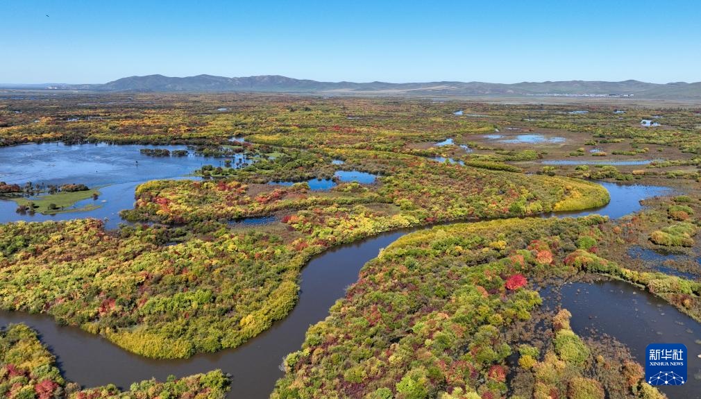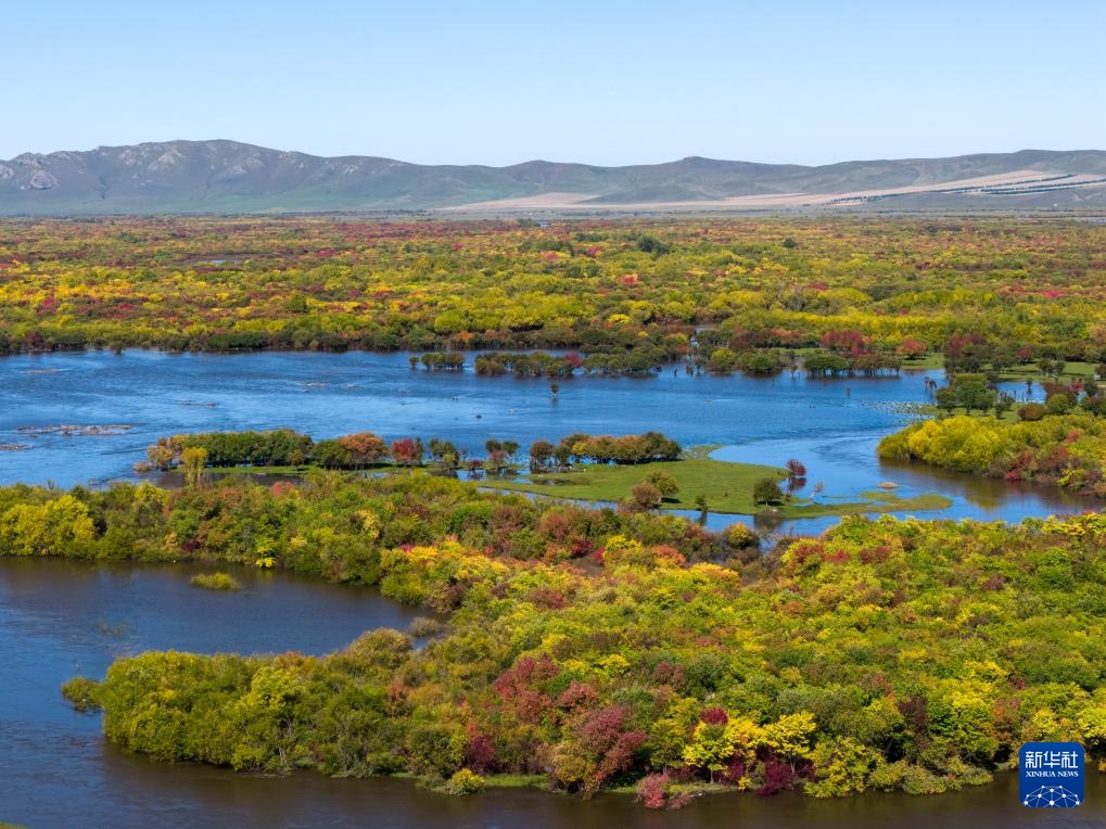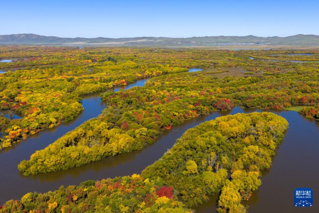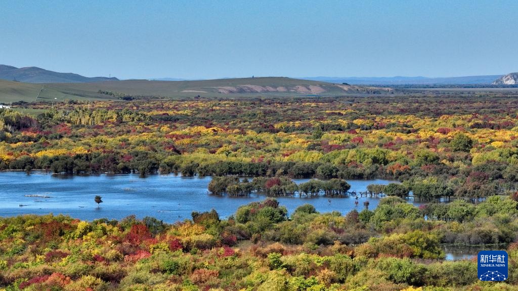 时下,内蒙古额尔古纳湿地迎来秋日盛景,多彩的灌木丛点缀其间,蜿蜒的河流如蓝丝带般静静流淌,宛若大自然打翻的调色盘。