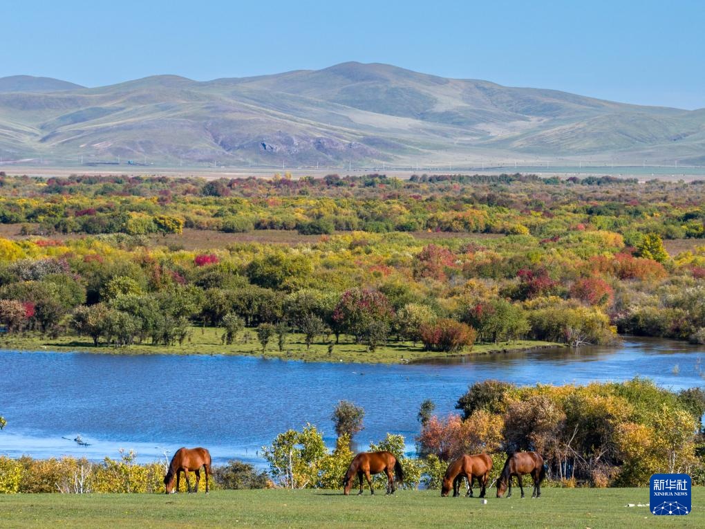 9月15日,马群在内蒙古额尔古纳市额尔古纳湿地旁吃草(无人机照片)。