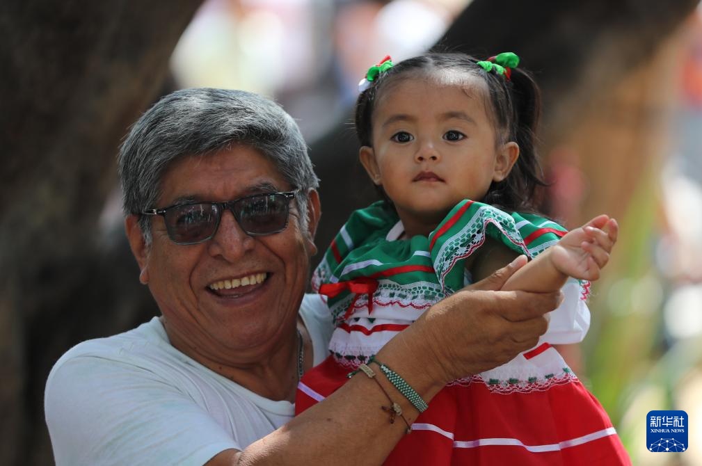9月16日,在墨西哥瓦哈卡州的瓦哈卡市中心,一名小女孩身着国旗颜色的传统民族服装,在家人带领下参加独立日庆祝活动。