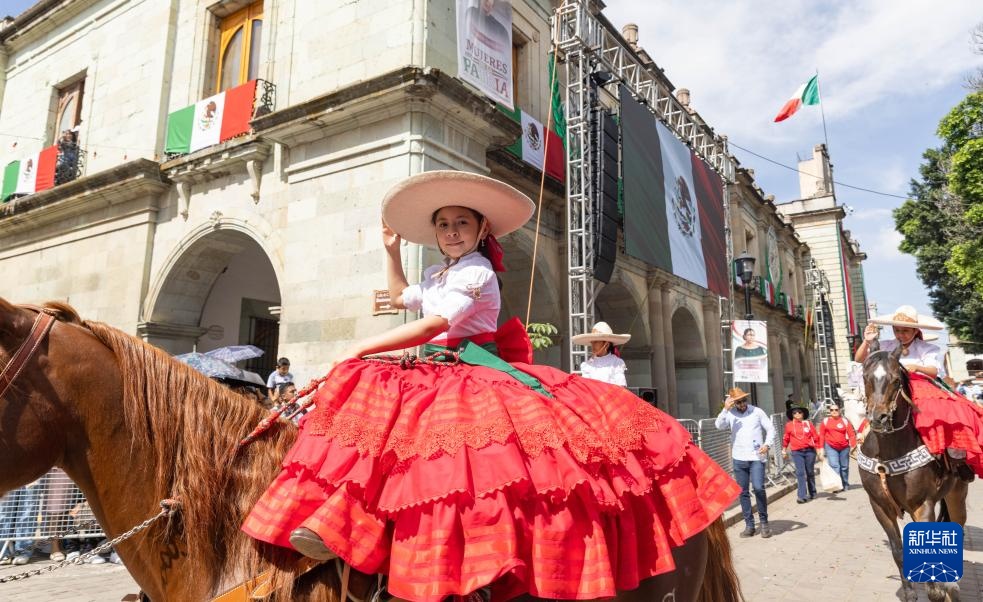 9月16日,在墨西哥瓦哈卡州的瓦哈卡市中心,身着传统民族服装的女孩骑马参加独立日庆祝活动。