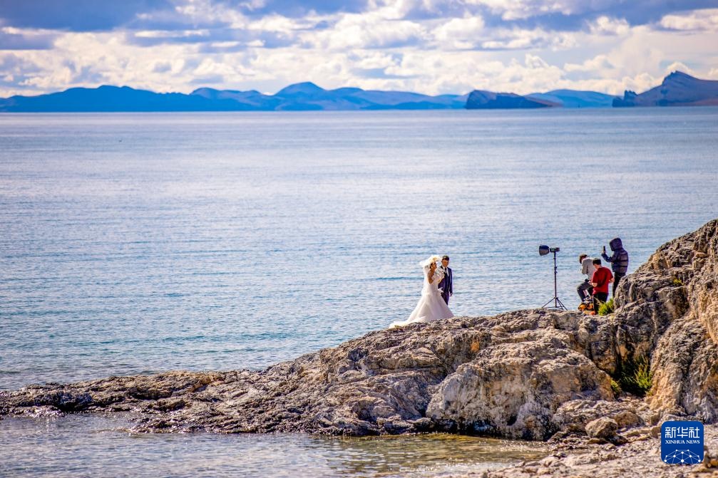 游客在纳木错湖边拍摄婚纱照(9月16日摄)。
