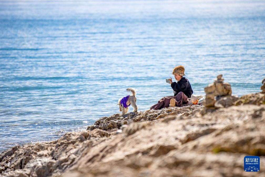 游客带着宠物狗在纳木错湖边拍照(9月16日摄)。