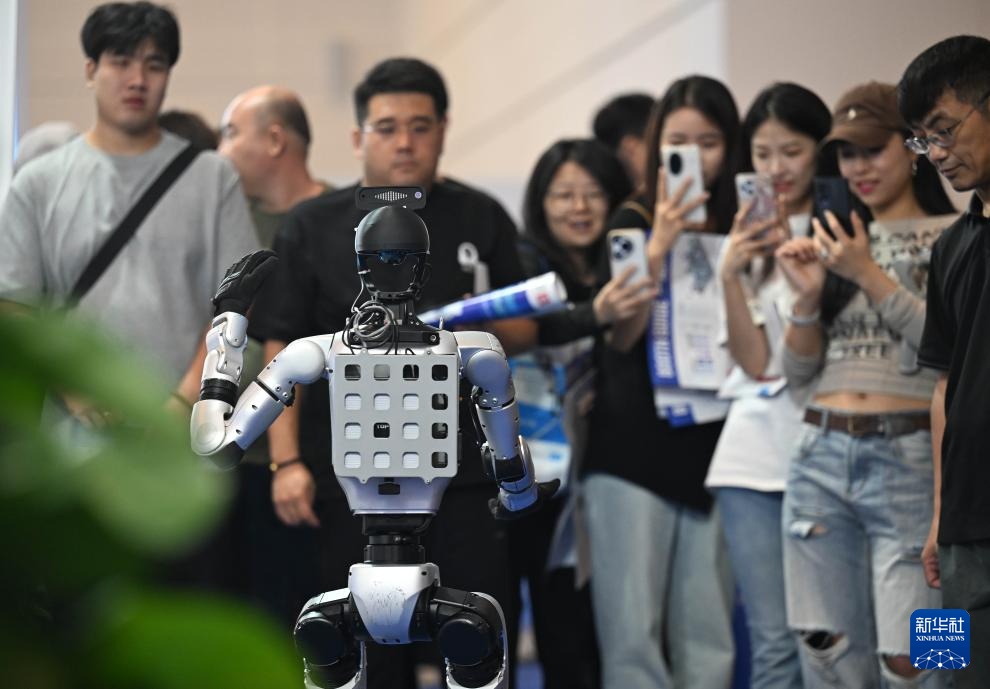 9月17日,参观者在展会现场观看一款人形机器人表演。