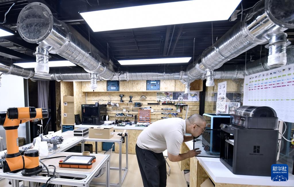 青年创业者在纪家庙双创产业园内的创意实践“梦工场”使用3D打印机(9月19日摄)。