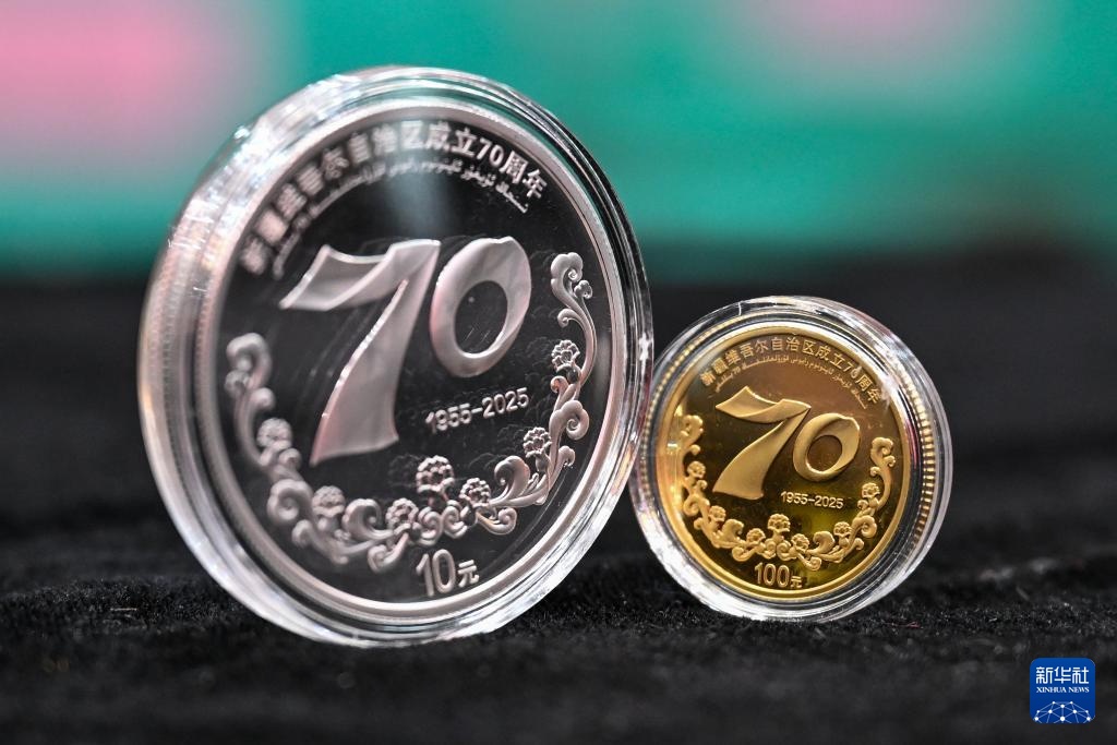 这是9月19日拍摄的新疆维吾尔自治区成立70周年金银纪念币。