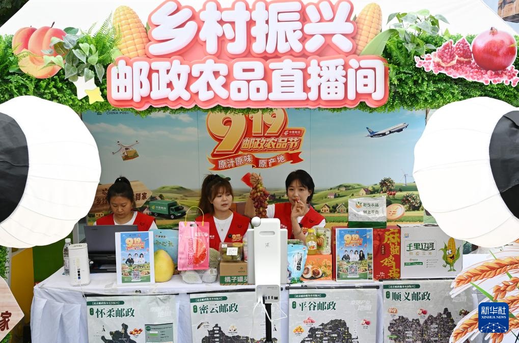 9月19日,邮政工作人员在北京西城金融街“邮味集市”现场用直播带货方式助推农产品。