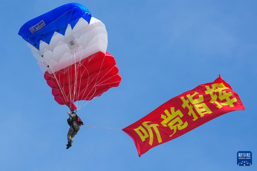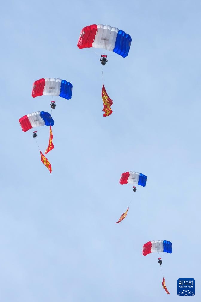 9月19日,空军航空大学“蓝鹰”跳伞队进行表演。