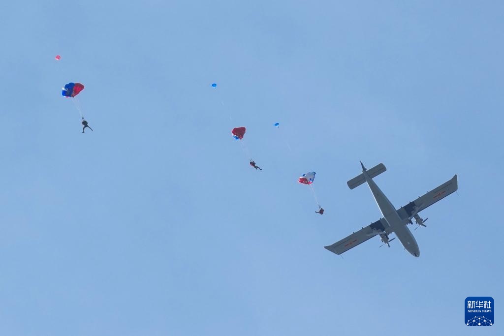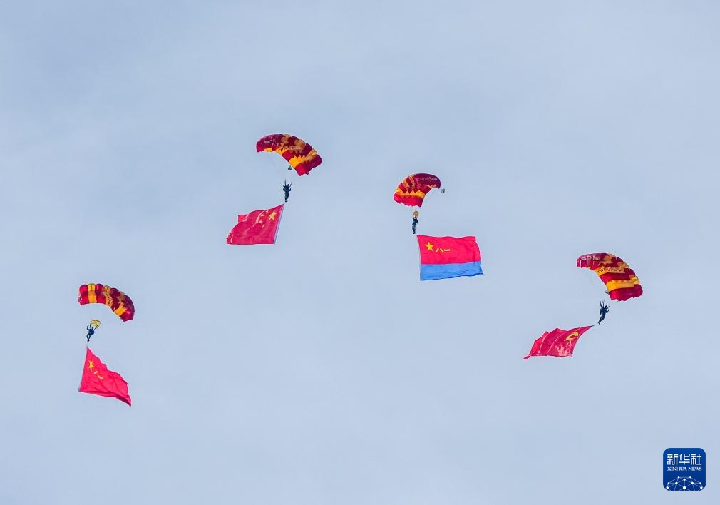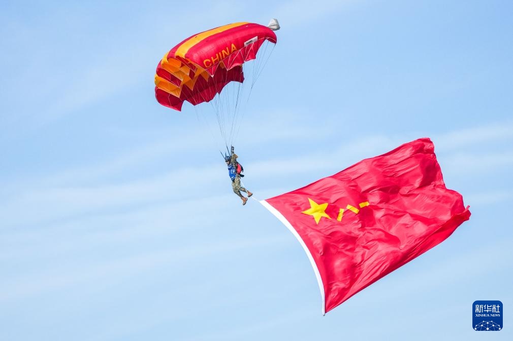 9月19日,空军八一跳伞队进行跳伞表演。