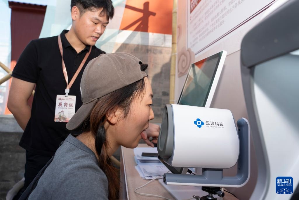 9月19日,市民在安徽中医药大学展台的智慧中医体验区查看舌苔。