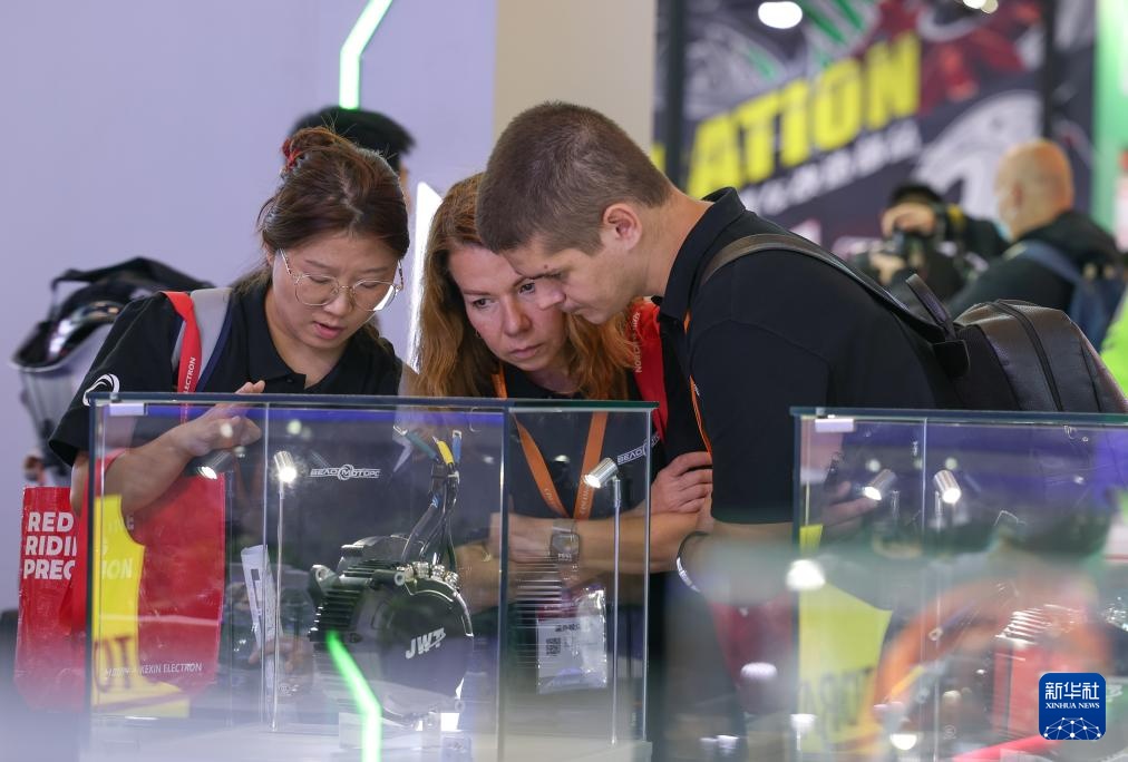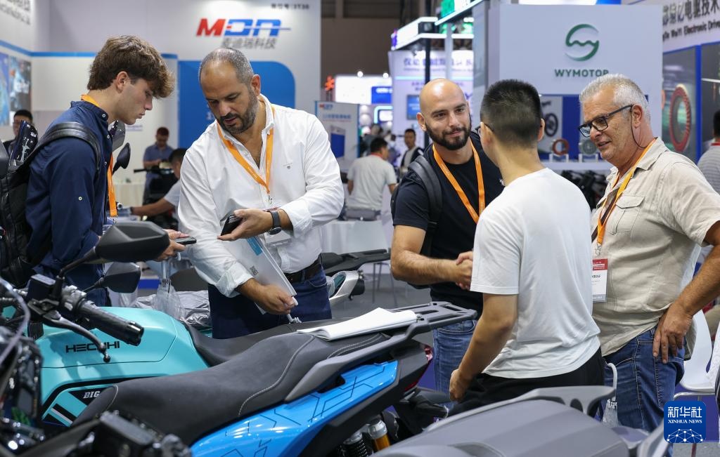 9月19日,参展商在摩博会现场了解摩托车用永磁同步电机。