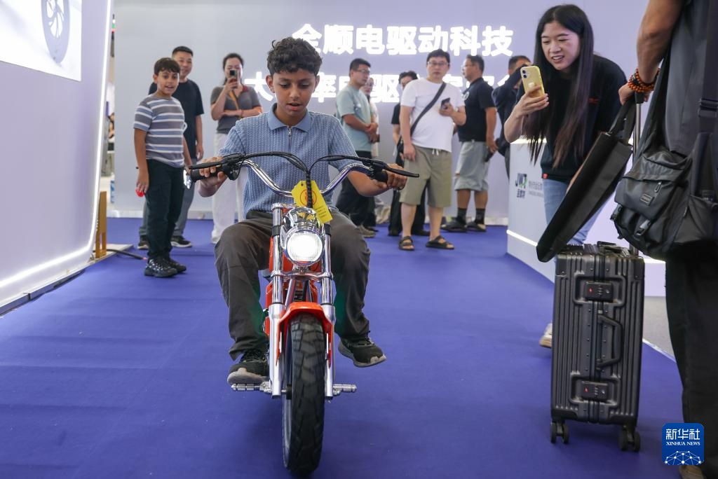 9月19日,小朋友在摩博会现场体验新能源摩托车。