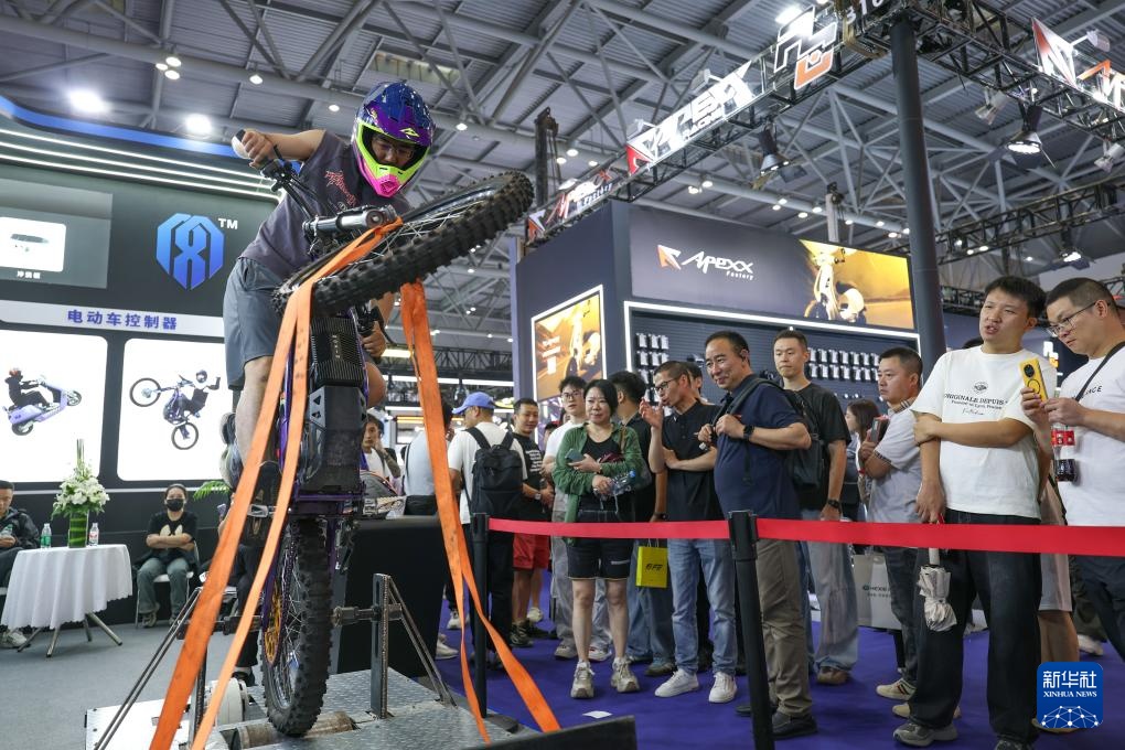 9月19日,观众在摩博会现场体验国产新能源摩托车控制器自动翘头功能。