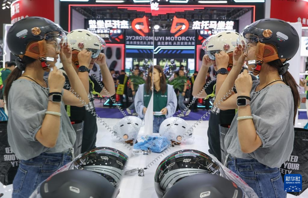 9月19日,观众在摩博会现场试戴摩托车头盔。