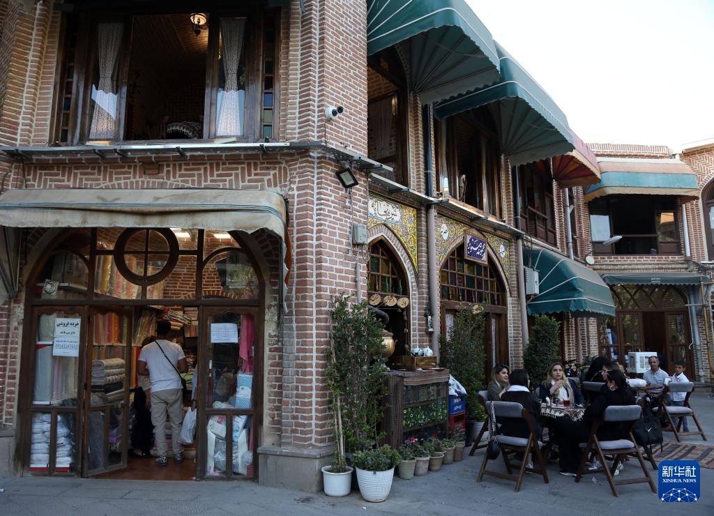 9月17日,在伊朗东阿塞拜疆省大不里士大巴扎,人们在一家餐厅外喝茶聊天。