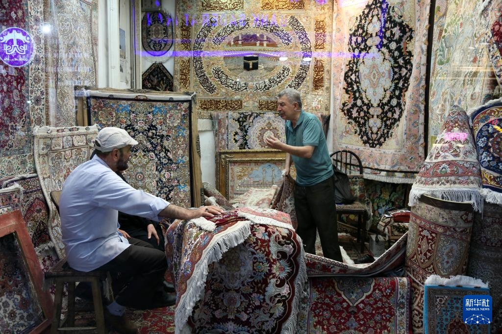 9月17日,在伊朗东阿塞拜疆省大不里士大巴扎,一名地毯商向顾客介绍地毯。
