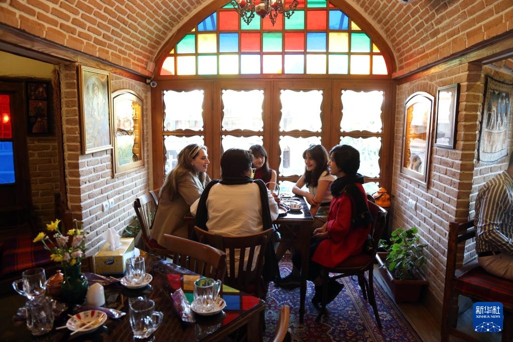 9月17日,在伊朗东阿塞拜疆省大不里士大巴扎,人们在一家餐厅内喝茶聊天。