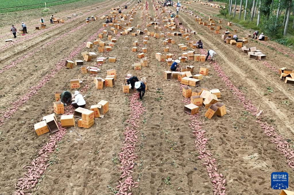 9月19日,河北省卢龙县清喜红薯种植合作社的社员在卢龙镇种植基地收获鲜食红薯(无人机照片)。