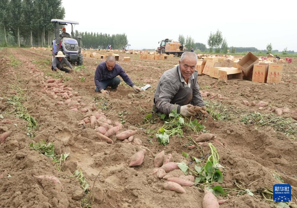 9月19日,河北省卢龙县清喜红薯种植合作社的社员在卢龙镇种植基地收获鲜食红薯。