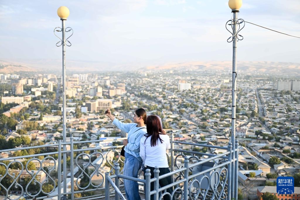 9月19日,在吉尔吉斯斯坦奥什,游客在苏莱曼山拍照。