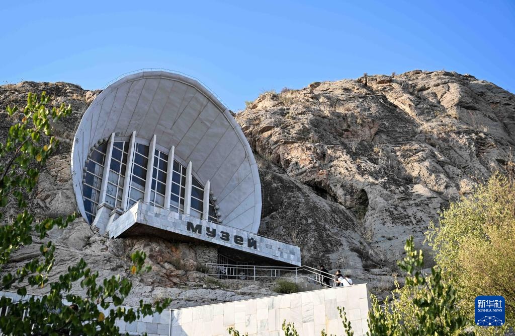 9月19日,在吉尔吉斯斯坦奥什,游客在苏莱曼山博物馆前游览。