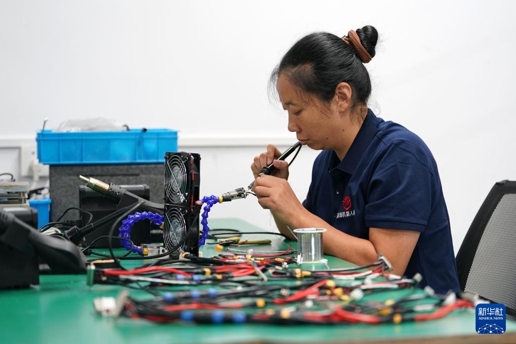 9月20日,河北省邢台市柏乡县一家机器人科技公司的员工在组装产品零部件。