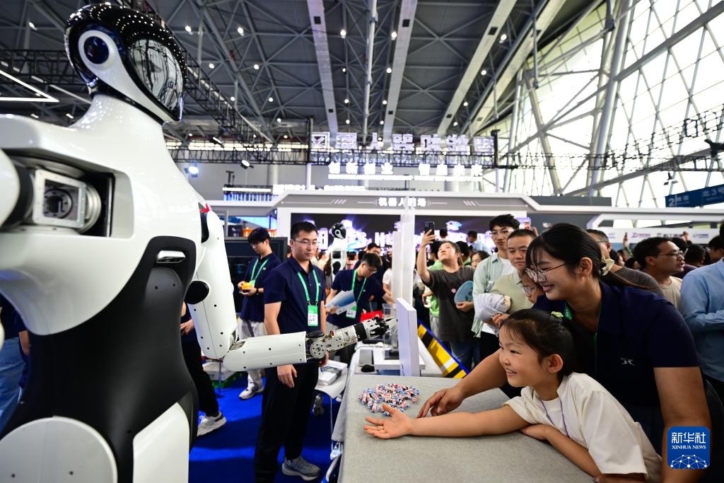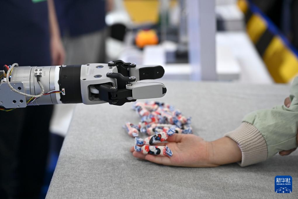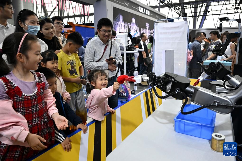 9月20日,在2025世界制造业大会上,机器人抓取糖果放到小朋友手上。