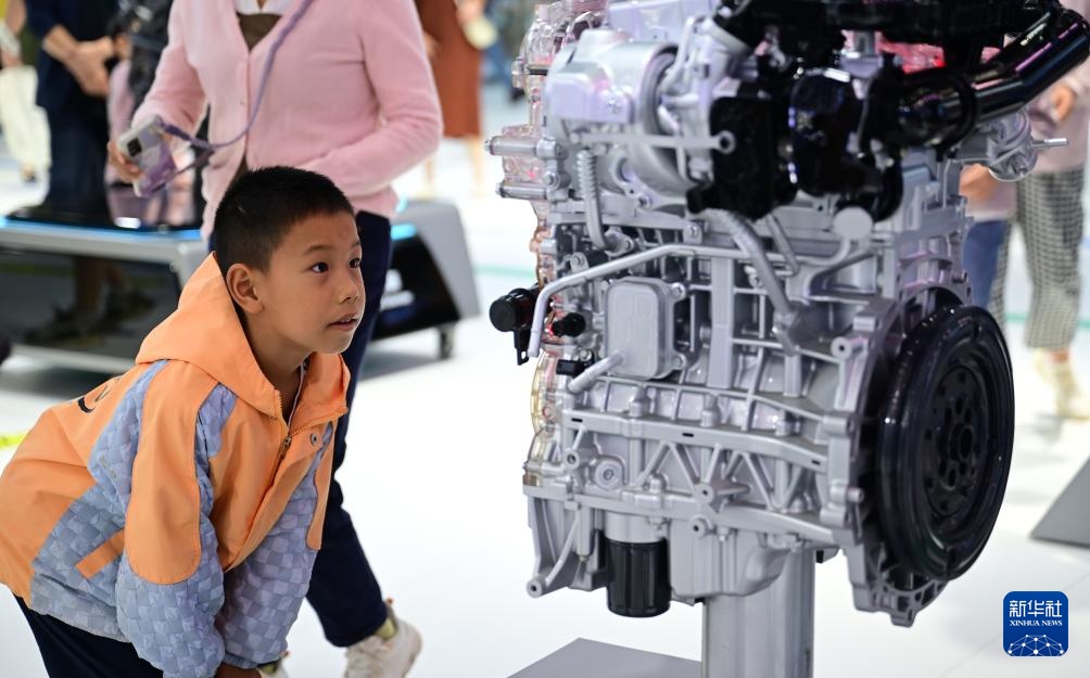 9月20日,小朋友在2025世界制造业大会上观看一款发动机。