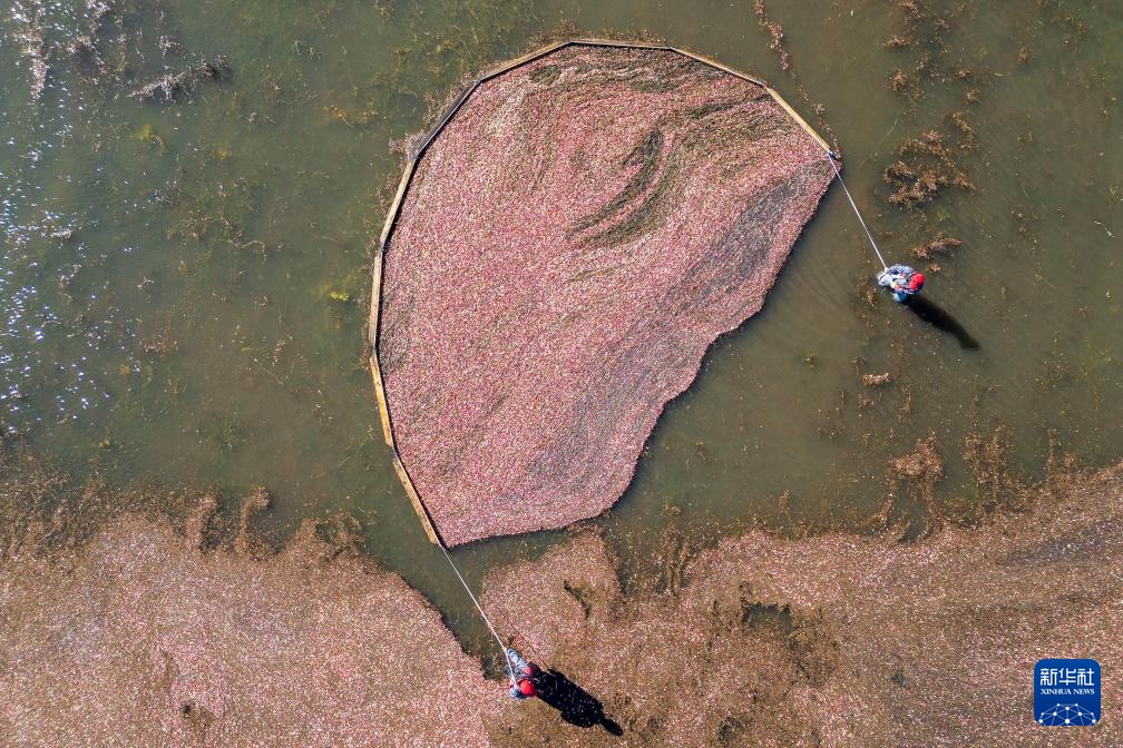 9月21日,在抚远市蔓越莓种植基地,工作人员在水中采收蔓越莓(无人机照片)。