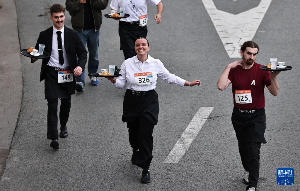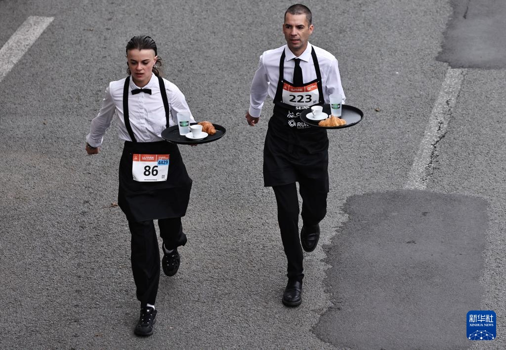 当日,法国首都巴黎举行具有百年历史的服务员赛跑活动。数百名穿着制服的男女服务员手托餐盘,餐盘内放着羊角面包、一个空咖啡杯和一杯水,从巴黎市政厅出发,沿环线跑完4公里的赛程。巴黎服务员赛跑最早始于1914年。今年还增加了普通民众赛跑环节。
