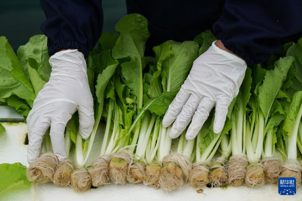 9月18日,工作人员在大棚内将采摘的奶白菜摆放整齐。