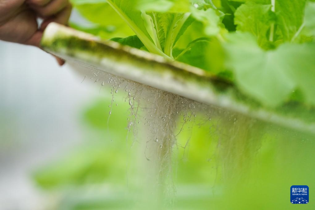 这是9月18日拍摄的使用气雾栽培技术生长的奶白菜根系。