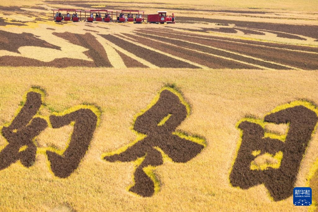 9月23日,在北大荒农垦集团闫家岗农场稻田艺术公园,人们乘坐小火车游览。
