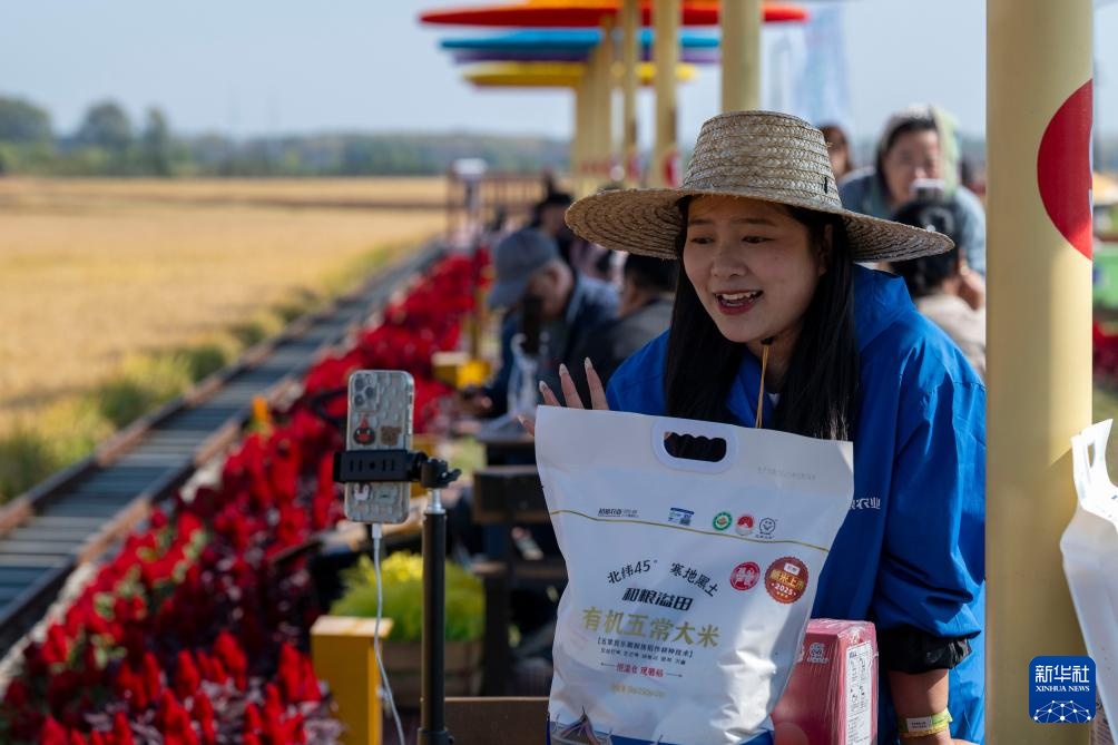 9月23日,网络主播在北大荒农垦集团闫家岗农场稻田艺术公园内直播。