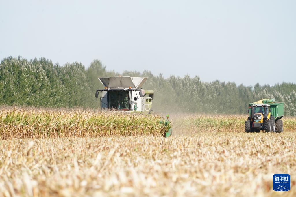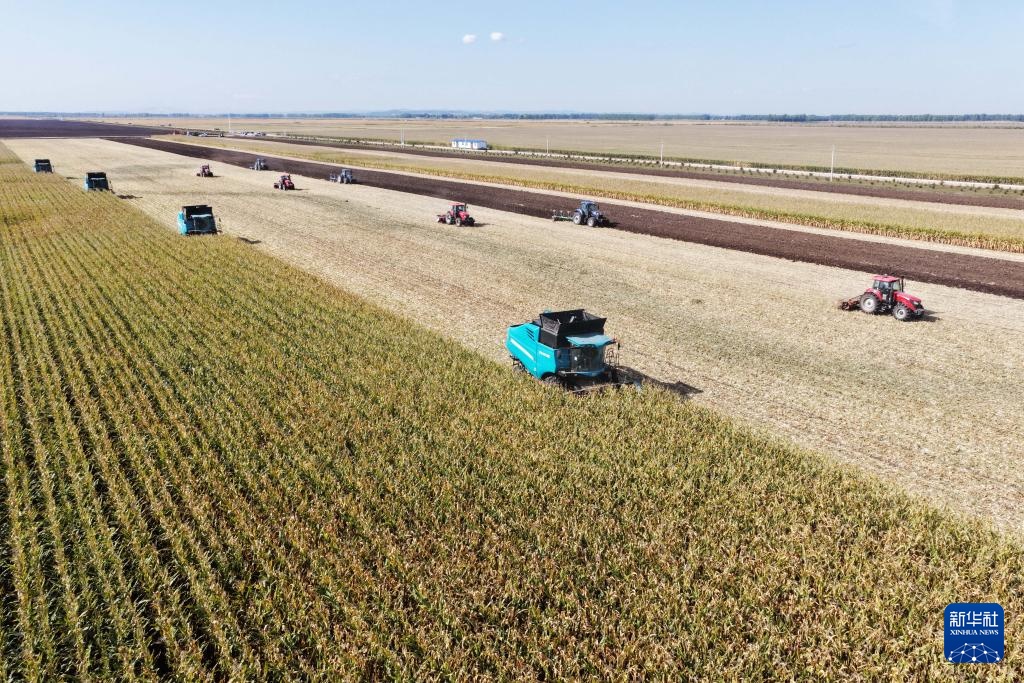 9月23日,在黑龙江北大荒农业股份有限公司友谊分公司一旱田地块,大型农业机械在进行玉米收获作业。