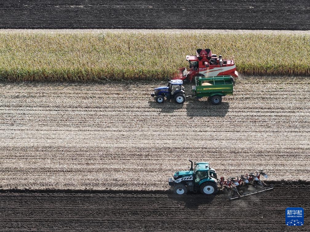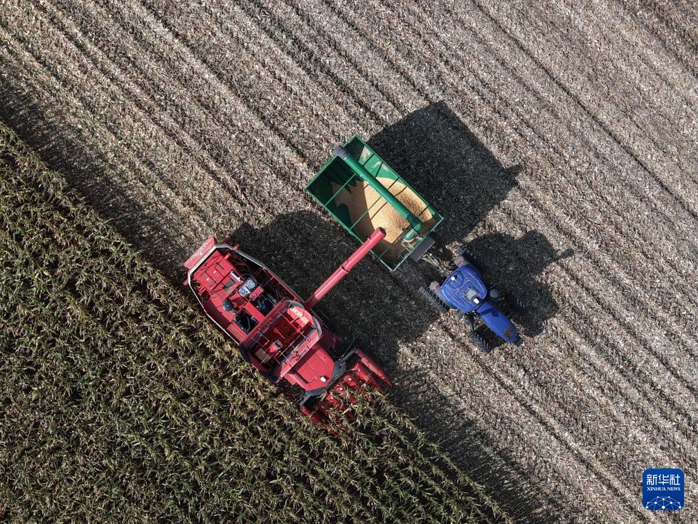 9月23日,在黑龙江北大荒农业股份有限公司友谊分公司一旱田地块,大型农业机械在进行玉米收获作业(无人机照片)。