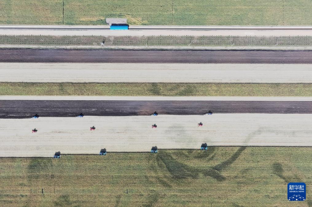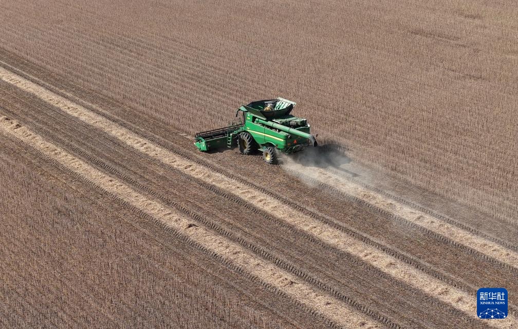9月23日,在黑龙江北大荒农业股份有限公司友谊分公司一旱田地块,大型农业机械在进行大豆收获作业(无人机照片)。