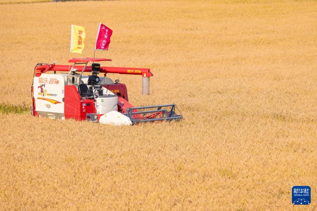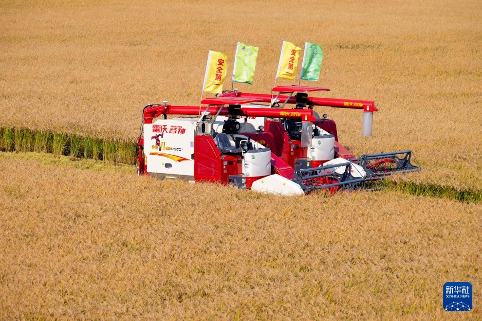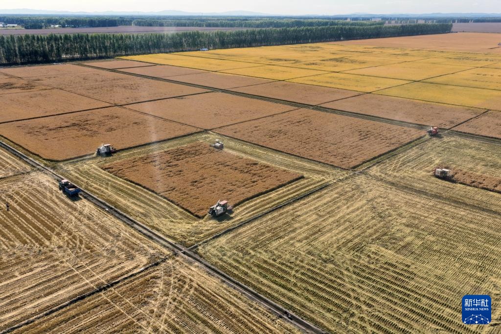 9月23日,在黑龙江北大荒农业股份有限公司友谊分公司一水田地块,大型农业机械在进行水稻收获作业(无人机照片)。