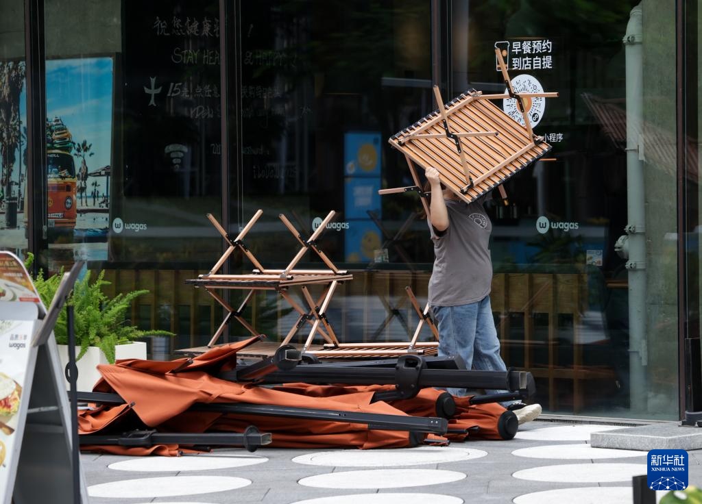 9月23日,在深圳市福田区一处商场,临街餐馆的服务员收拾室外桌椅设施。
