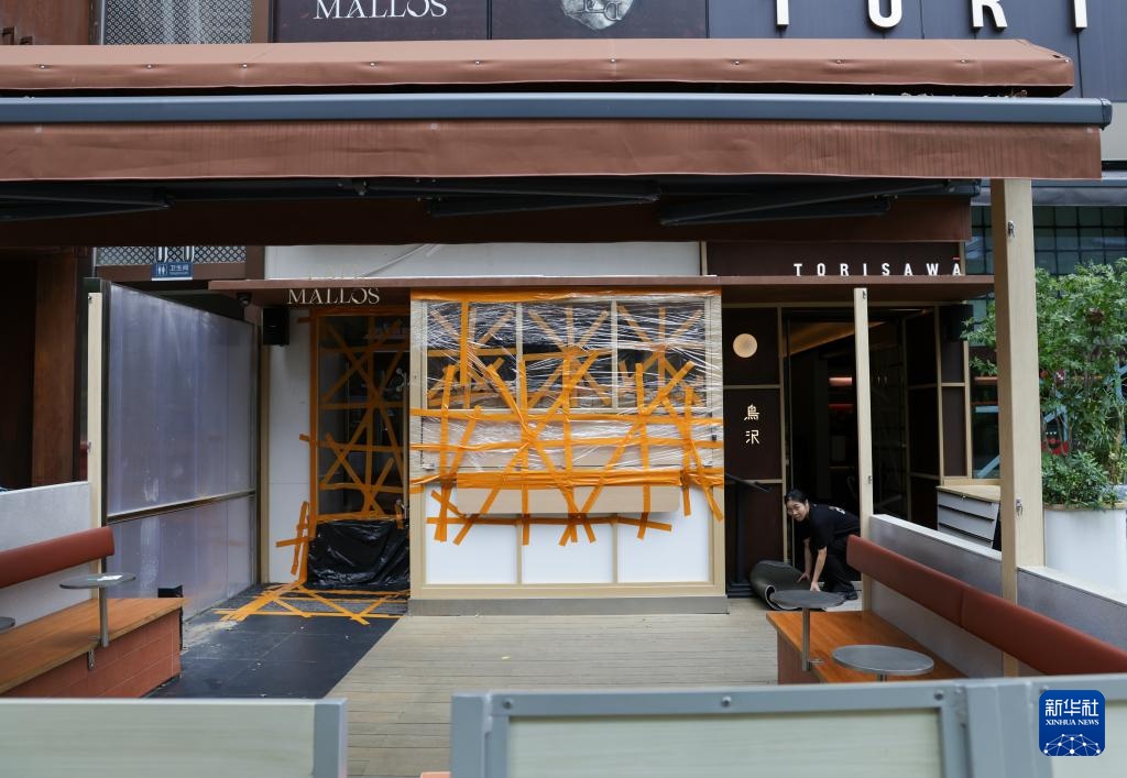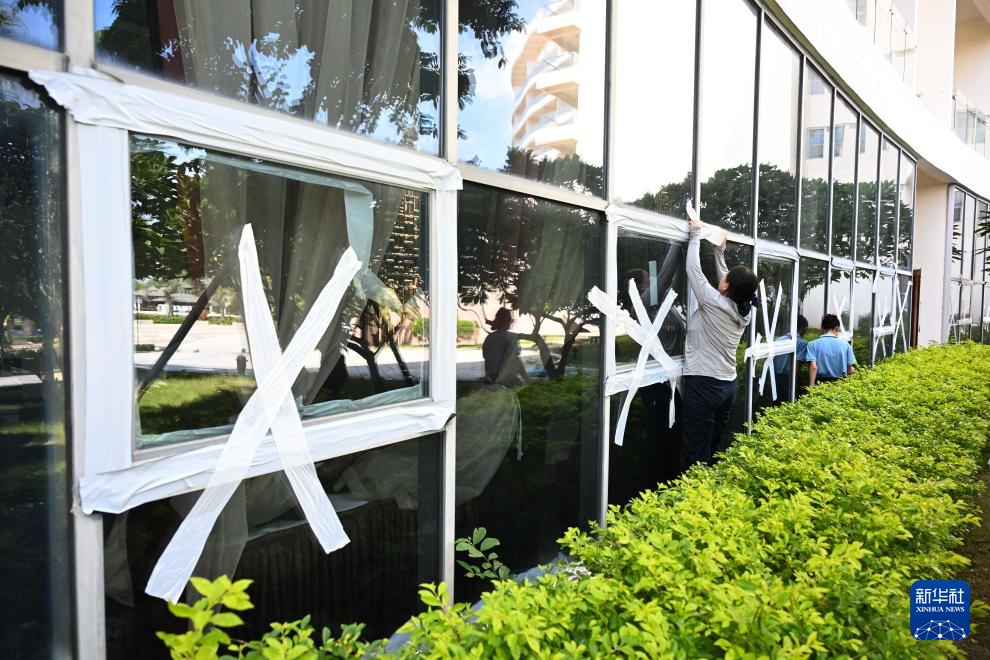 9月23日,在广东阳江市海陵岛的海韵戴斯酒店,工作人员在给玻璃门贴上胶带。